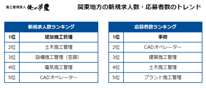 関東地方の新規求人数では、建築施工管理が最も多くなっていました。