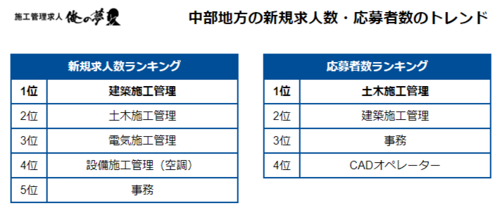 新規求人数・応募者数ともに、土木施工管理が建築施工管理に続きます。