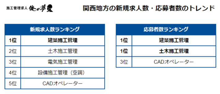関西地方の応募者数では、建築施工管理と土木施工管理が同率1位となっていました。