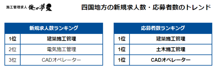 四国地方の応募者数では、建築施工管理・土木施工管理・CADオペレーターの3職種が同率1位となっていました。
