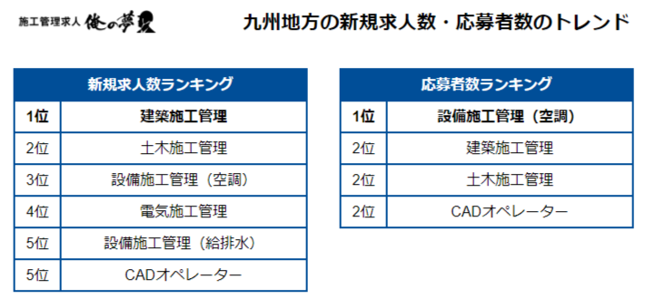 九州地方の応募者数でトップだった職種は、設備施工管理(空調)でした。