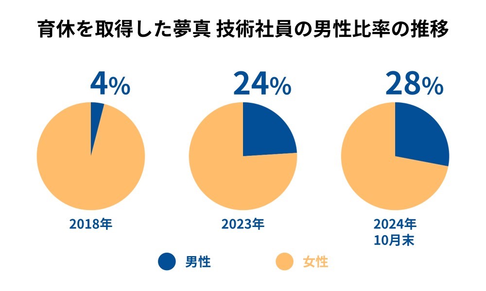 男女比で見てみると、2018年の産休・育休取得者数の割合は女性96%に対し男性は4%で24対1の割合でした。2023年は女性76%に対し男性24%で約3対1、2024年は10月末時点で女性72%に対し男性28%で男性比率がさらに増えています。