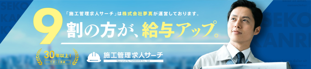 施工管理求人サーチは、施工管理技術者の転職・派遣支援のパイオニアである株式会社夢真が運営する施工管理派遣で全国に常時7,000件の求人を持つ専門サイトです。