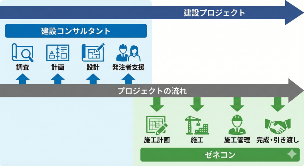 【図解】建設コンサルタントとゼネコン(建設会社)の違い
