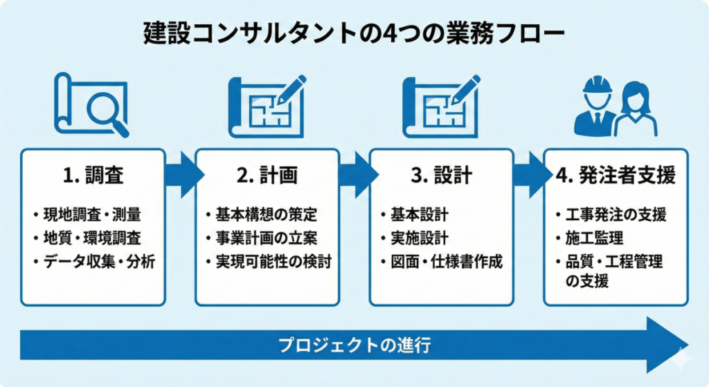 建設コンサルタントの仕事内容は?4つの業務フローを解説